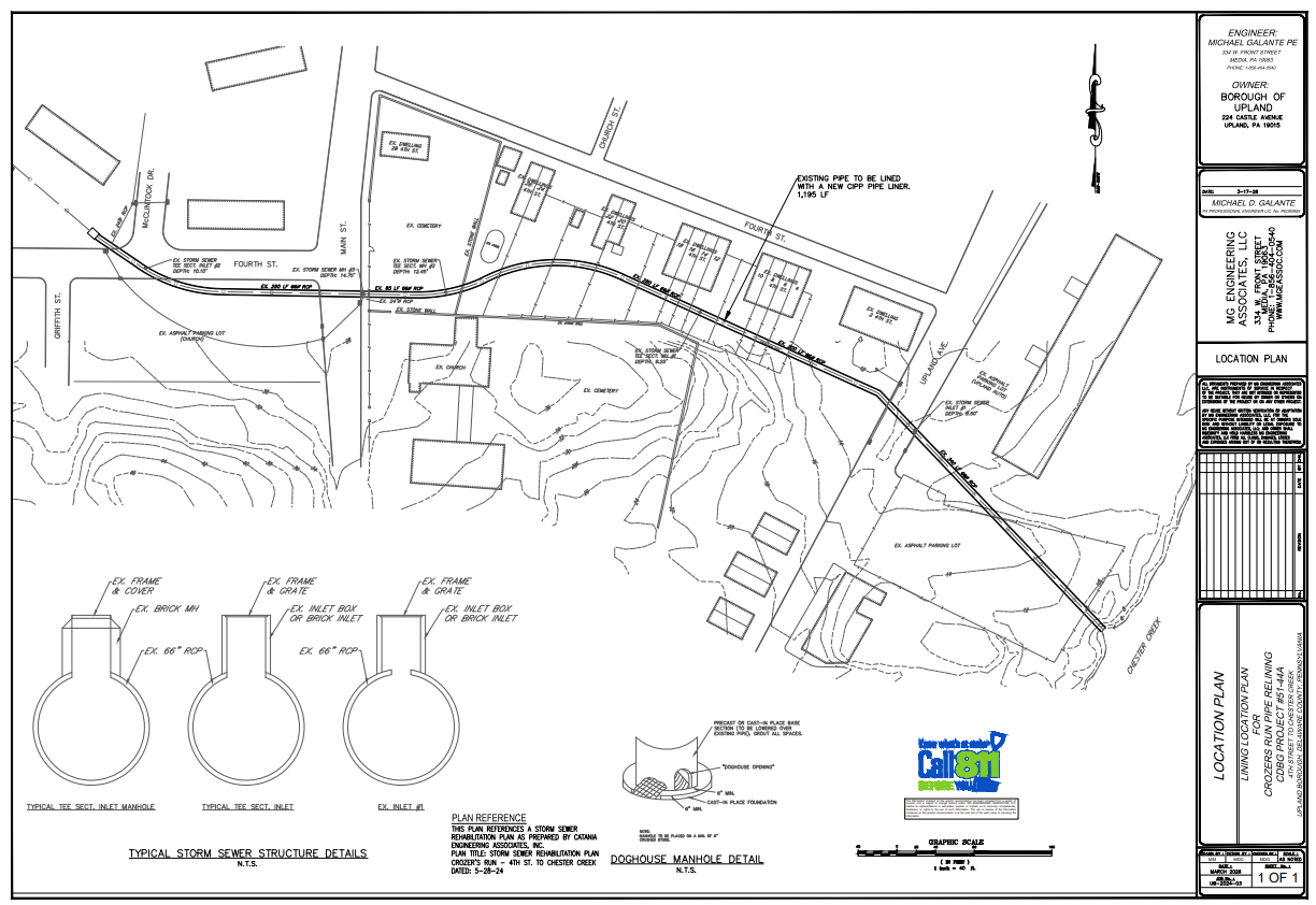 The plan also documented existing pipe sections requiring trenchless lining, allowing the system to be restored internally rather than replaced through excavation.